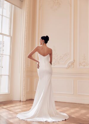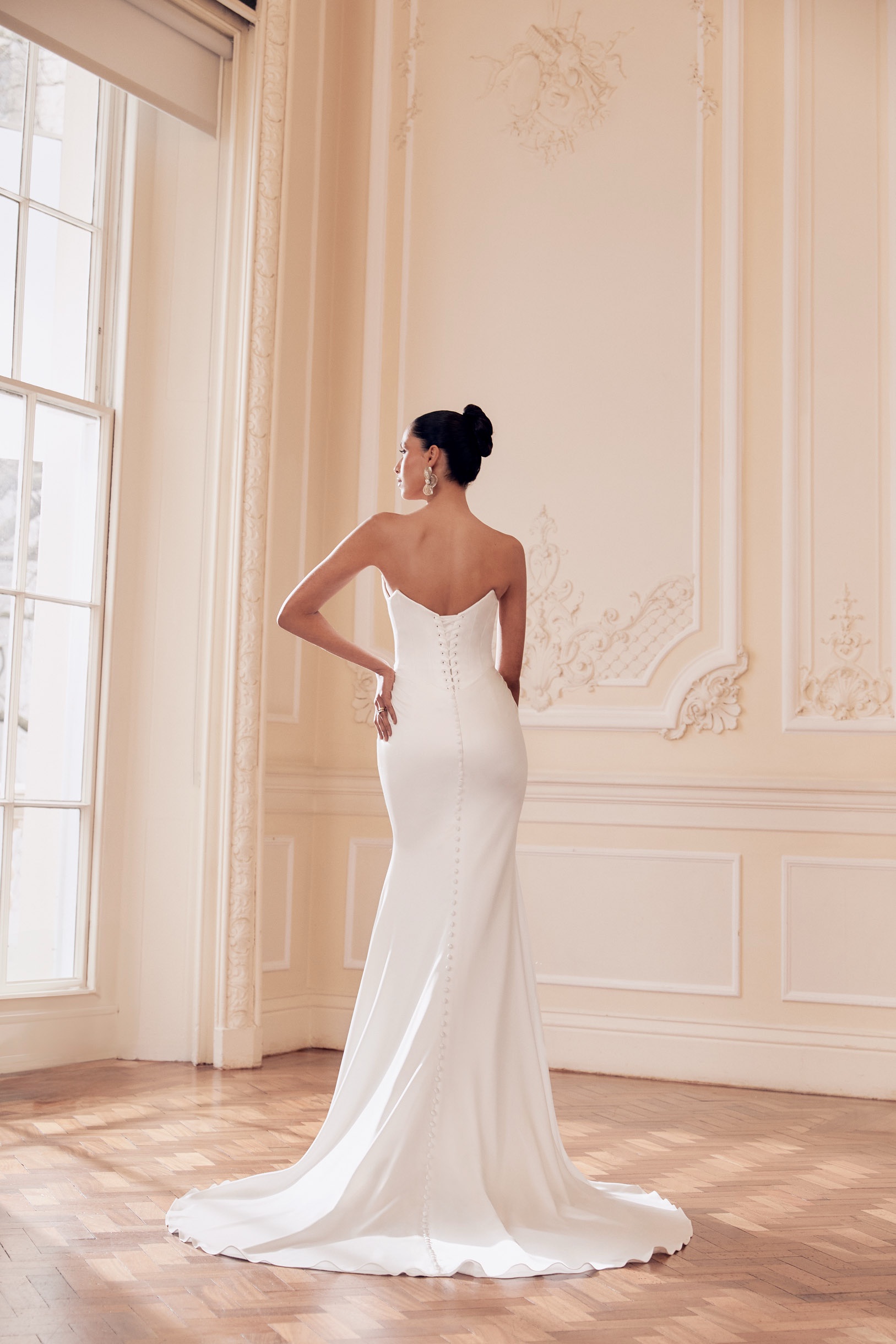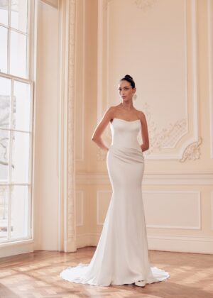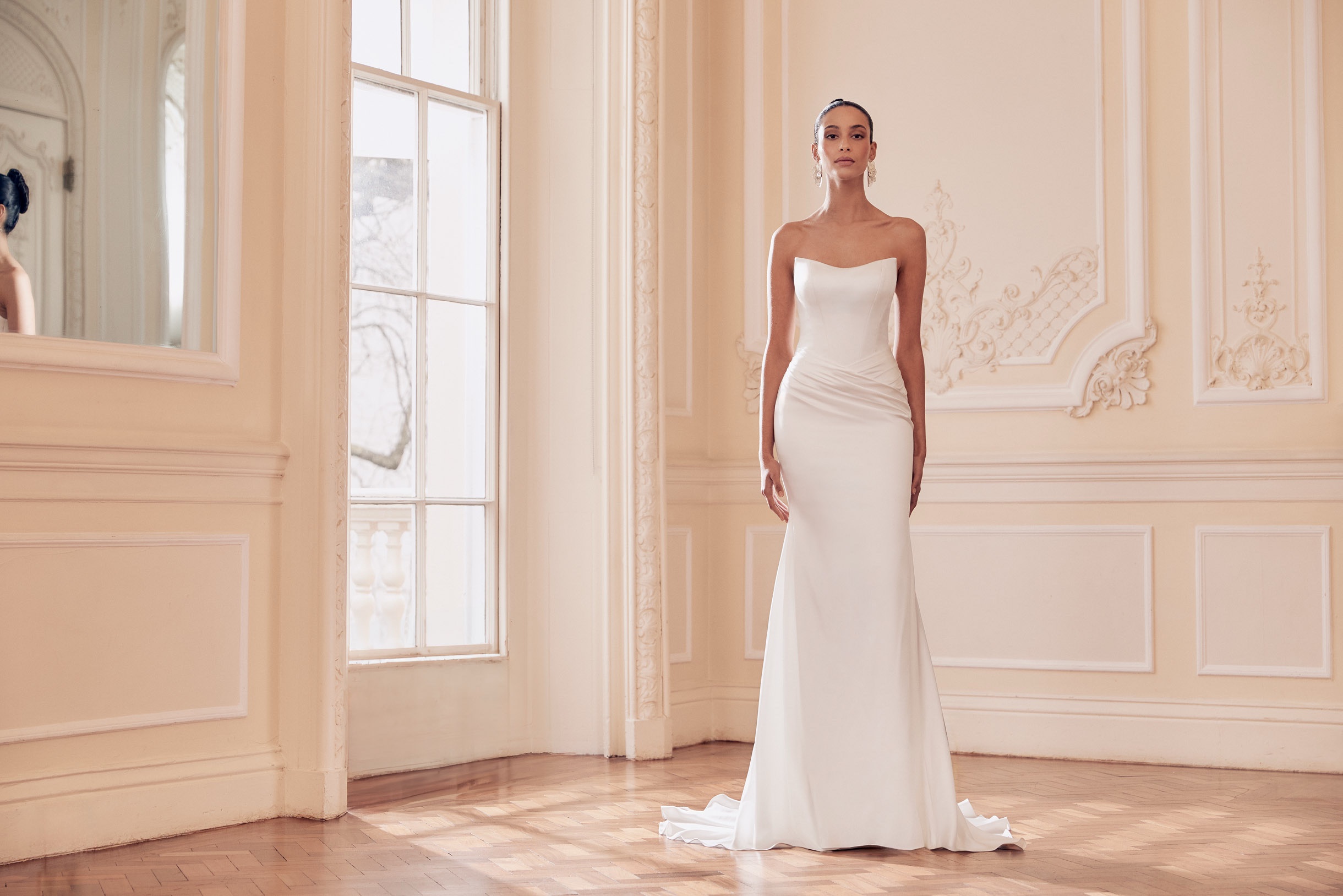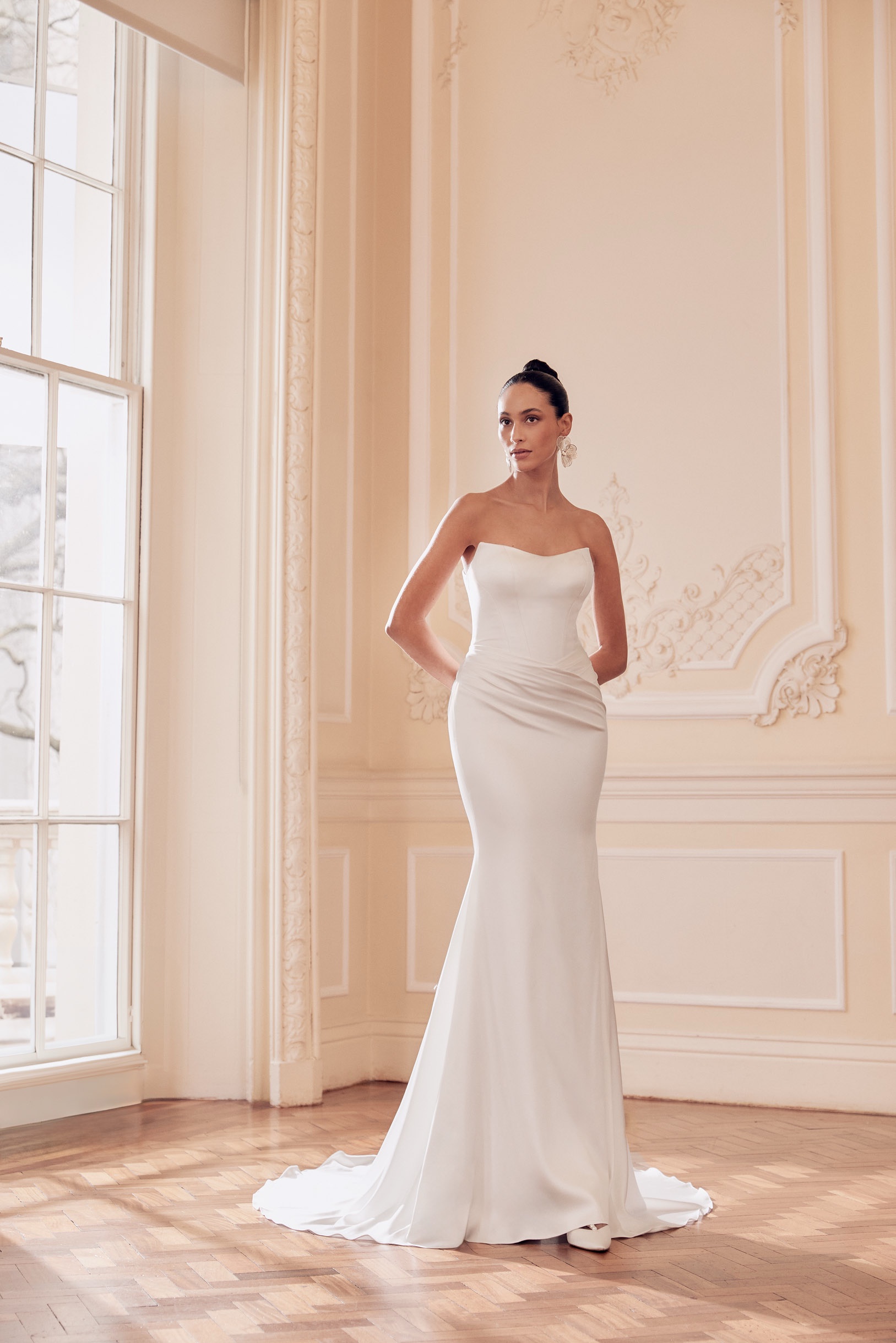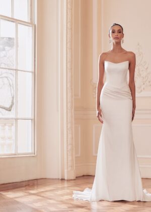 Designed for the modern bride, Athena sculpts the body in sleek satin with soft draping across the hips that offers subtle tummy coverage and flattering shape. The corseted bodice enhances the waist, while a slightly scooped neckline frames the décolletage with refined elegance. An eyelet lace-up back adds intricate detail and adjustable support, while pairing the gown with the Michaela cape creates a dramatic statement. Athena combines contemporary sophistication with flattering structure, perfect for brides who appreciate thoughtful construction and modern romance.