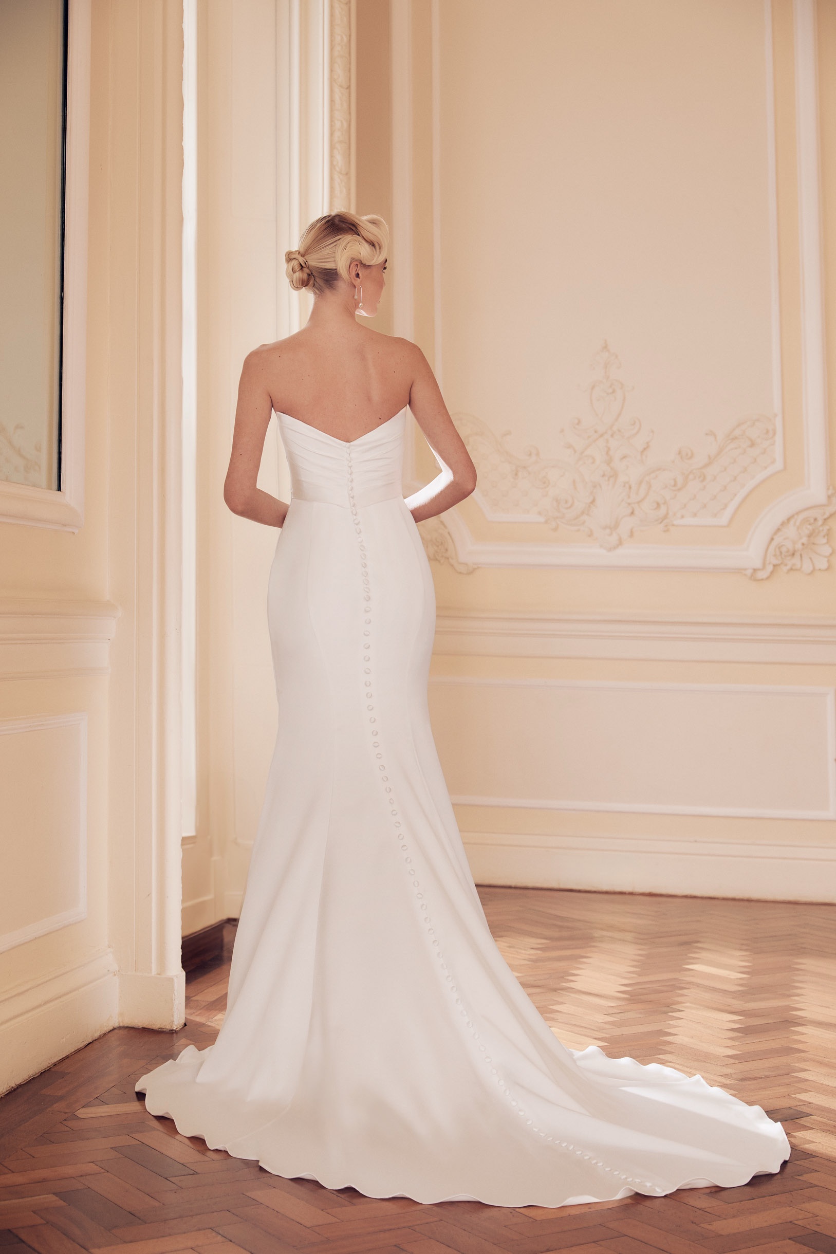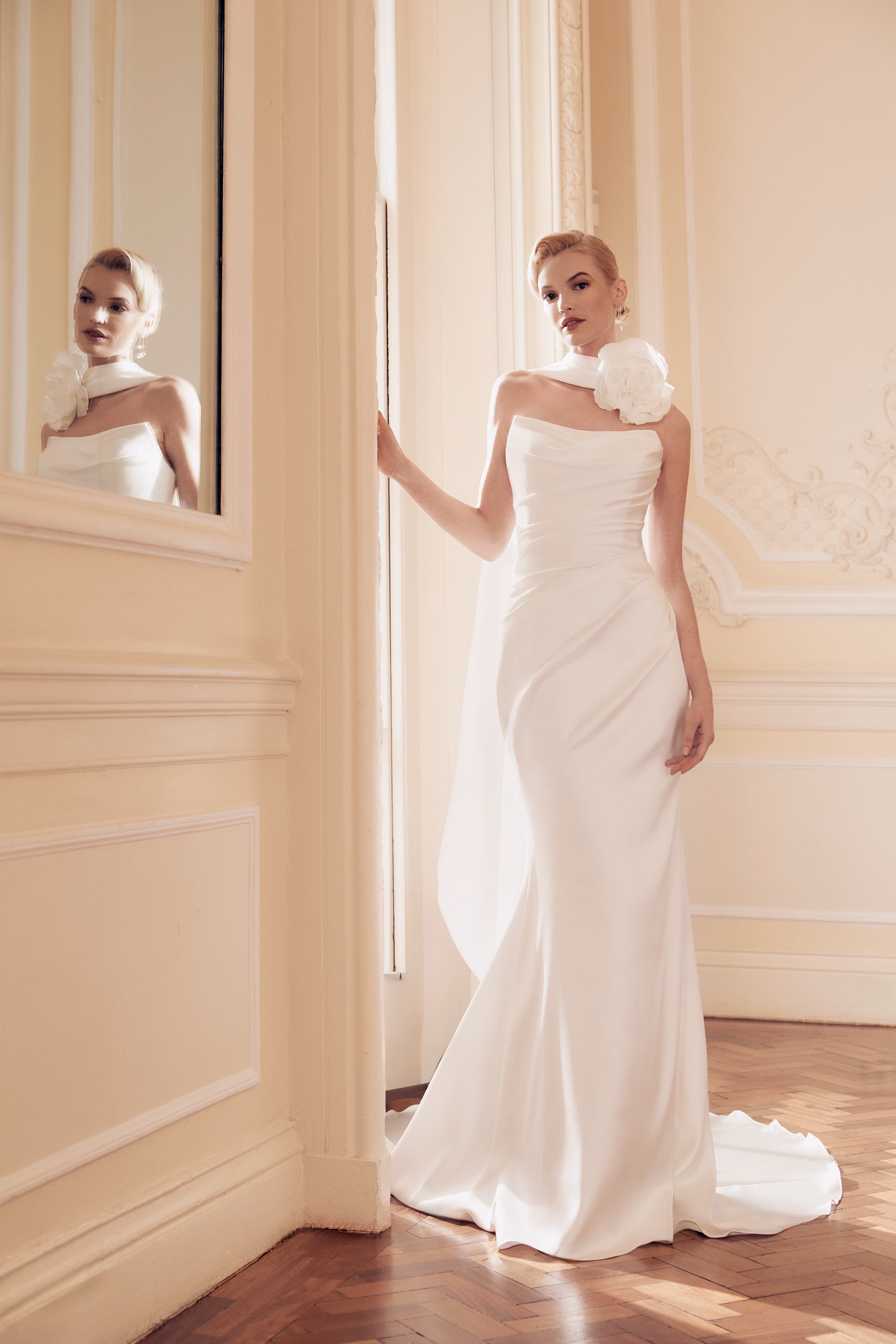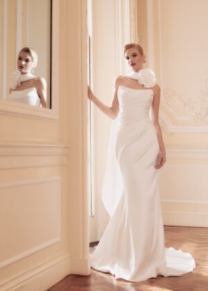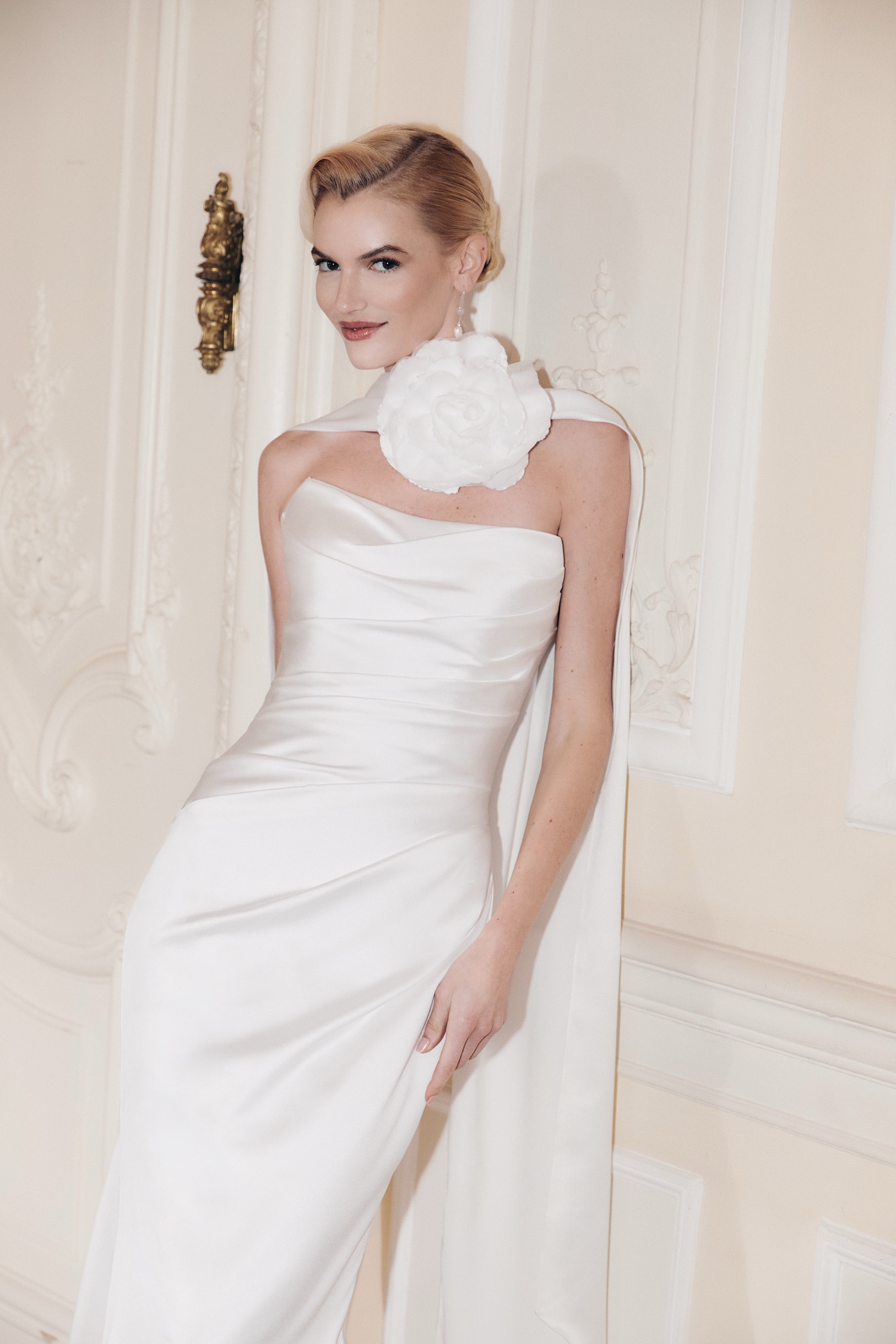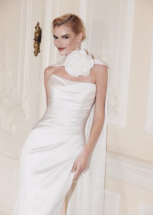 Sculpted elegance defines Gabriella, a sleek satin sheath gown that skims the figure for a refined, polished silhouette. Her gently curved neckline softens the profile and highlights the décolletage with subtle sophistication. Perfect as a base gown for personal styling, Gabriella offers brides a clean, timeless canvas to accessorize with veils, capes, or statement jewelry. Sleek, graceful, and versatile, she embodies understated modern romance.