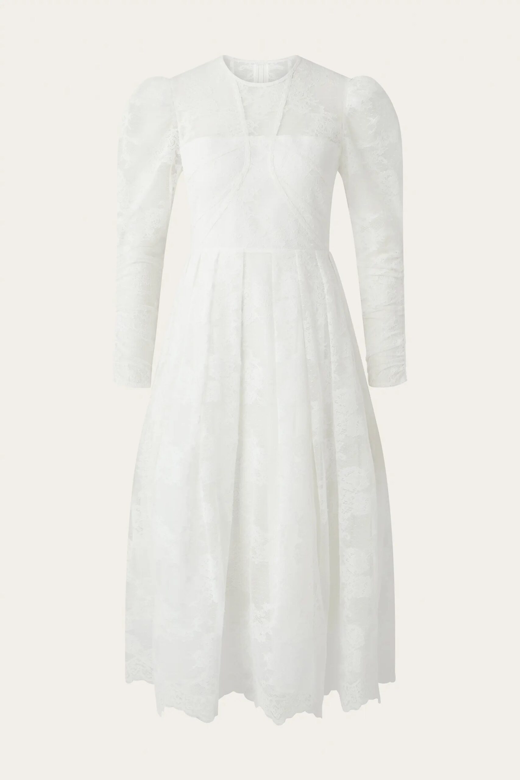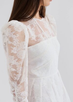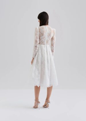 Midi dress in delicate lace with ruched sleeves and a flared, flowy hemline.