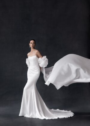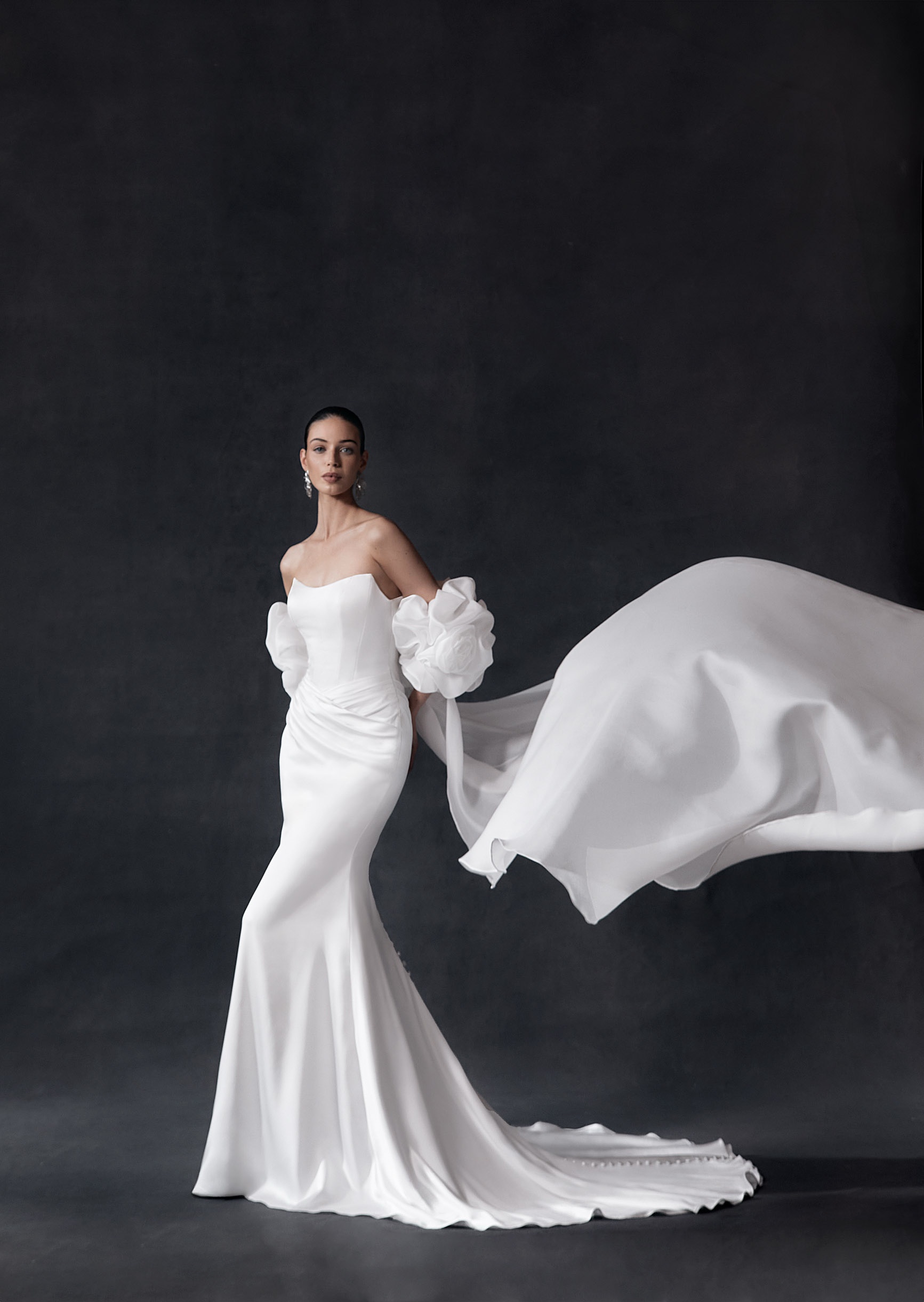Drama and romance combine in Michaela, a sweeping organdy cape that transforms a gown into a statement of grandeur. Voluminous floral bunch sleeves and flowing layers create movement with every step, adding both elegance and a theatrical sense of occasion. Perfect for brides who want to make a bold, unforgettable entrance, Michaela elevates any bridal look with sophisticated flair while maintaining a romantic, ethereal quality.