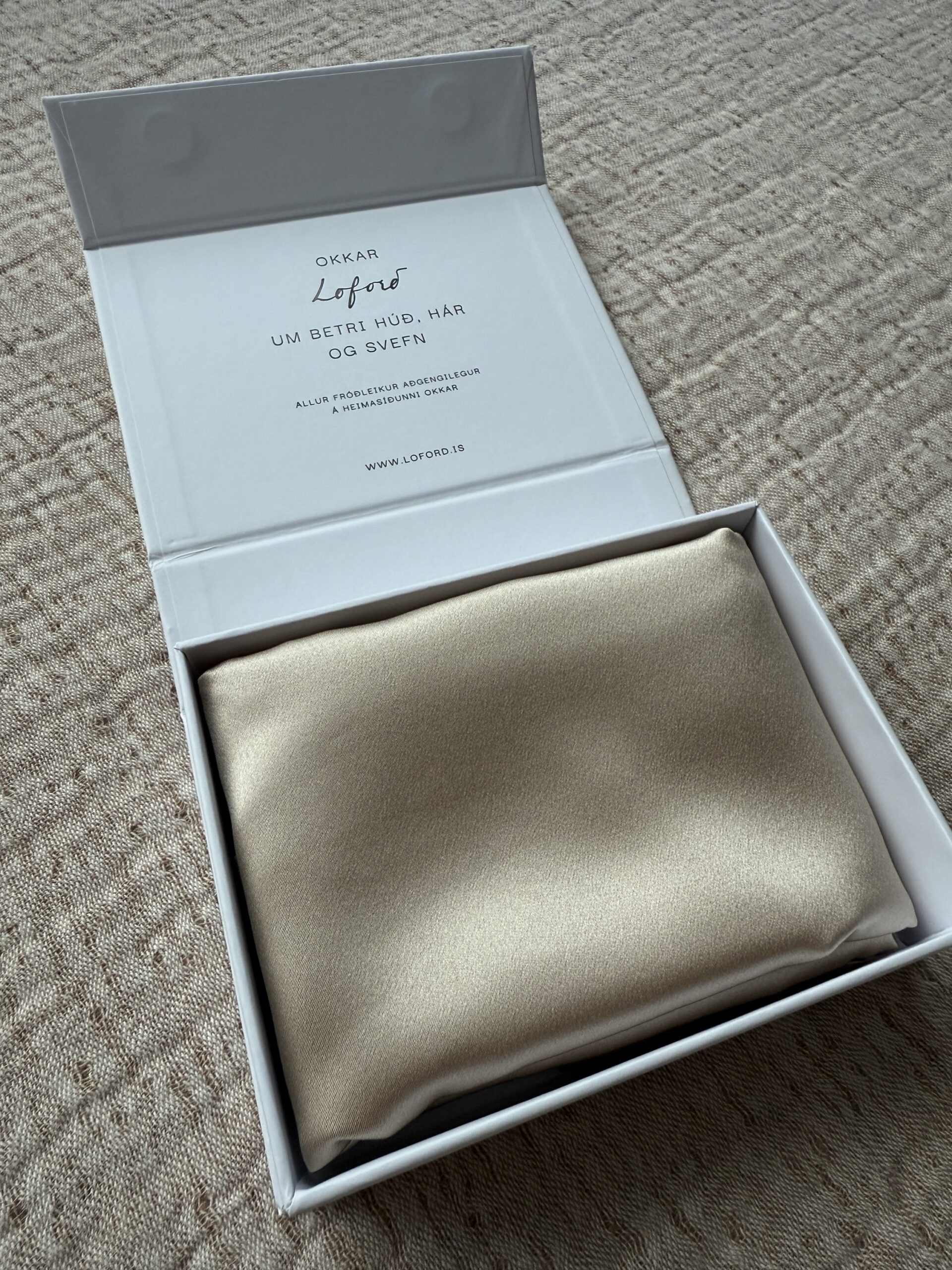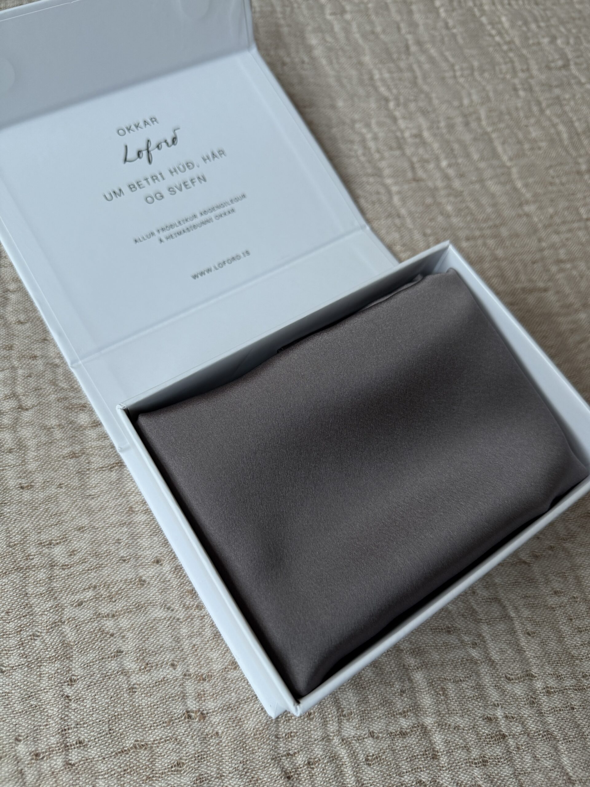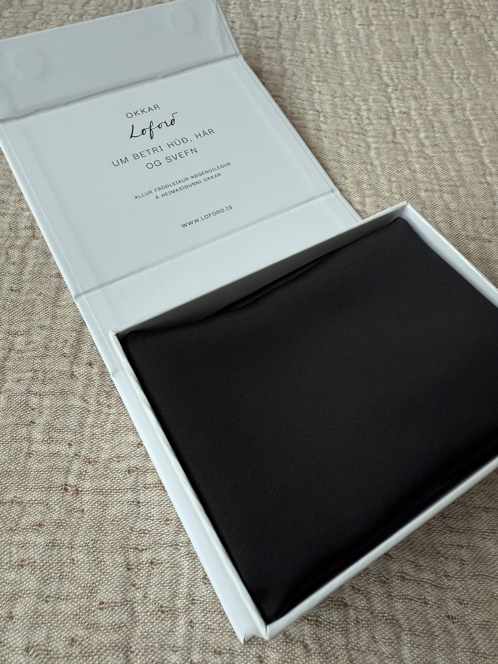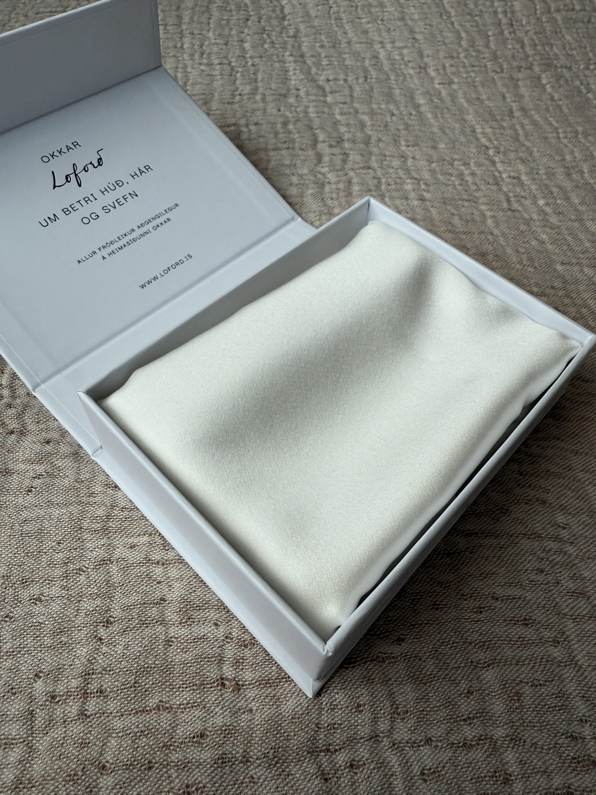 Koddaverið kemur í fallegri gjafaöskju sem er vel merkt með Loforð Silki logo-inu. Svo ef um er að ræða gjöf er ekkert mál að skipta.