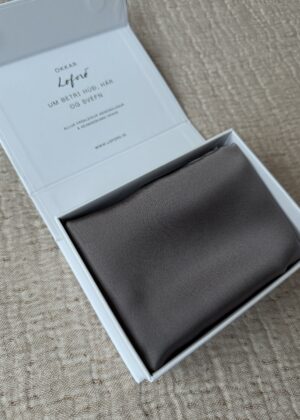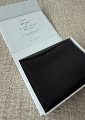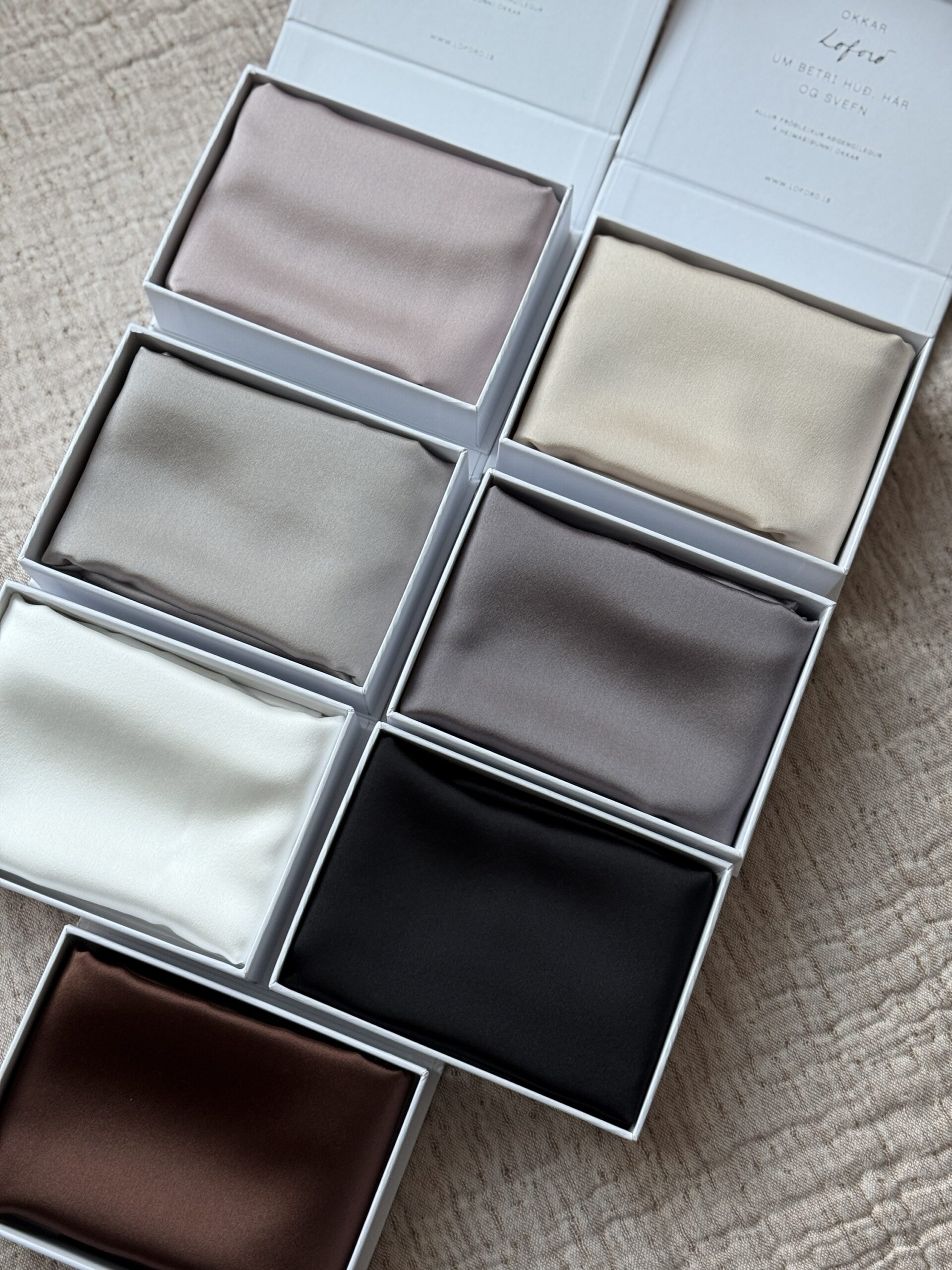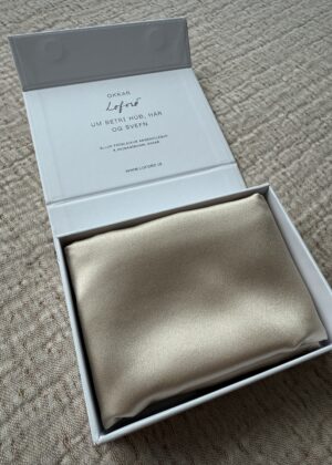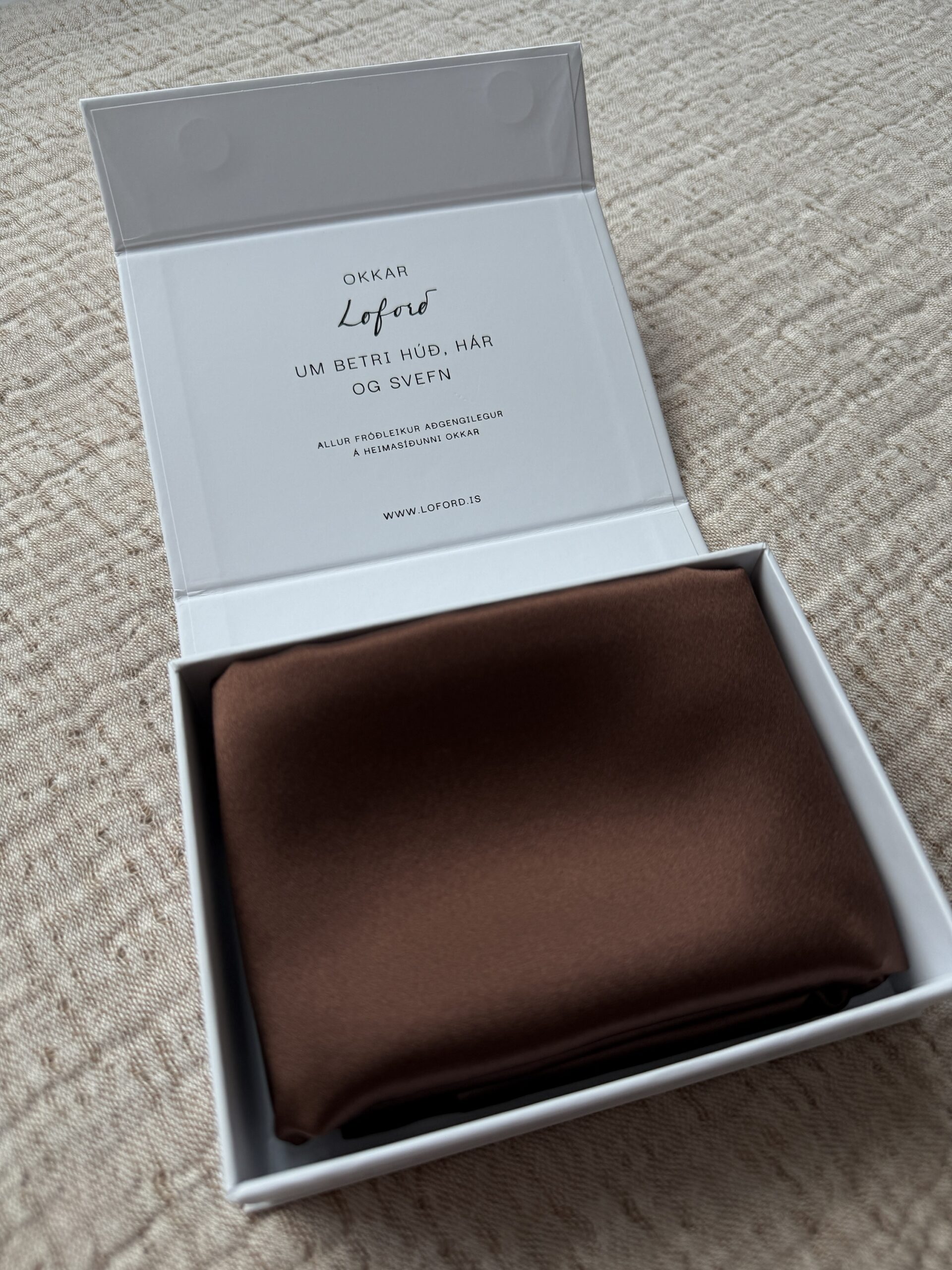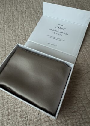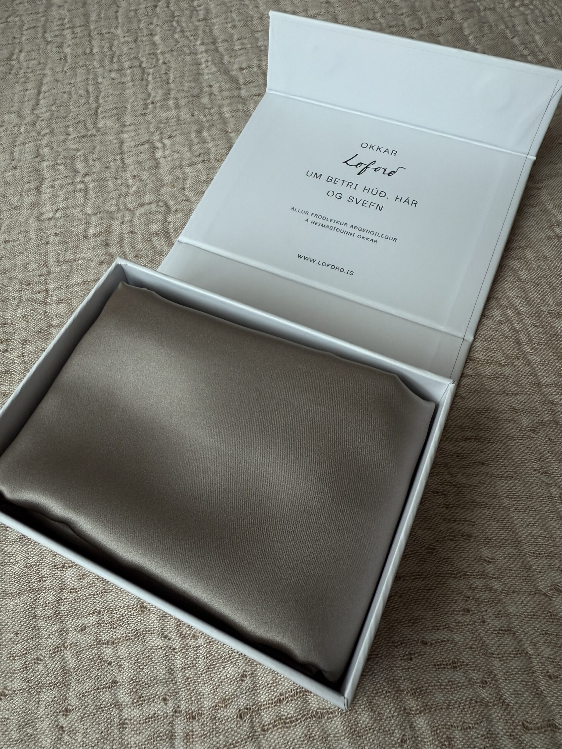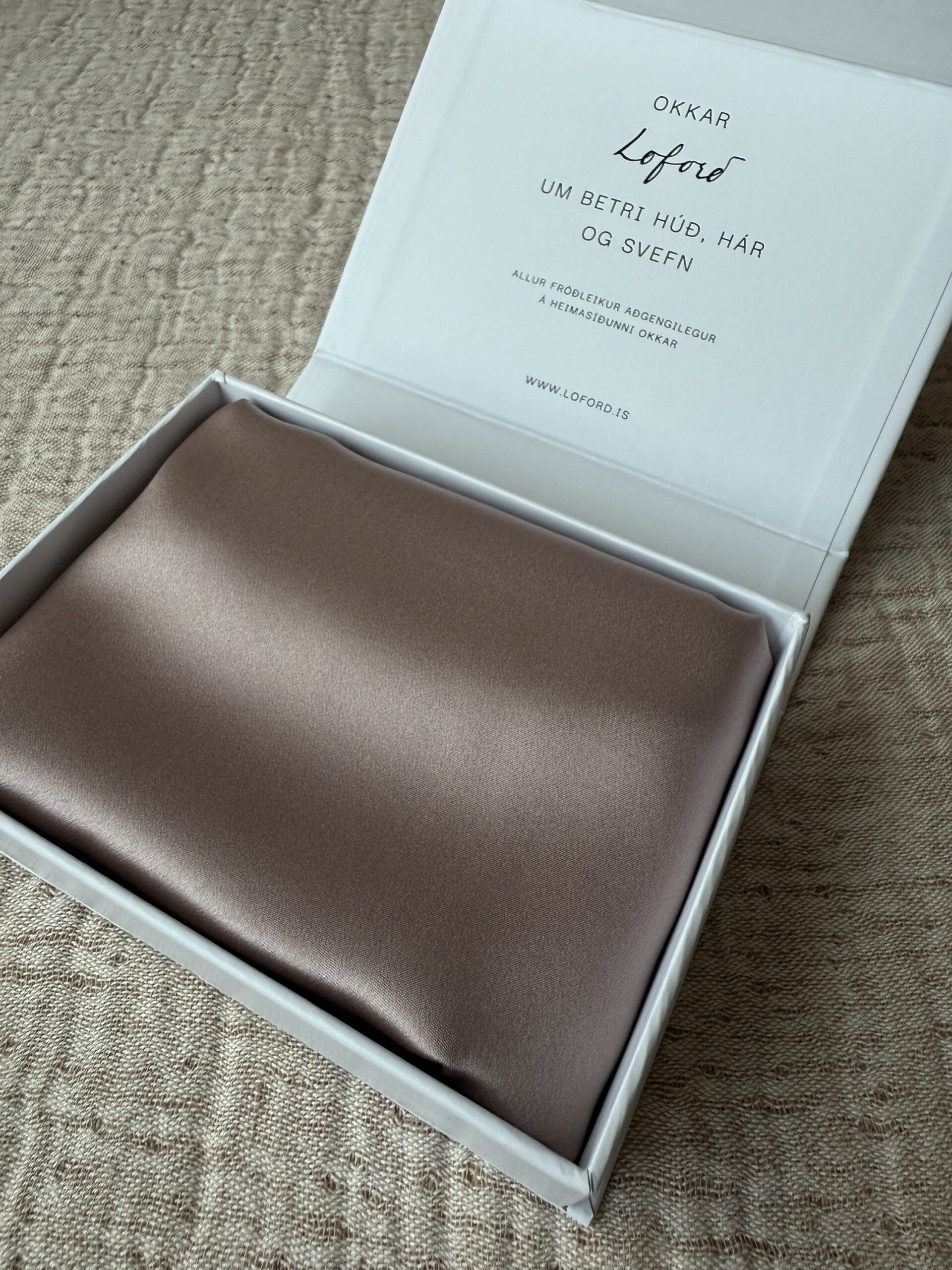 Koddaverið kemur í fallegri gjafaöskju sem er vel merkt með Loforð Silki logo-inu. Svo ef um er að ræða gjöf er ekkert mál að skipta.